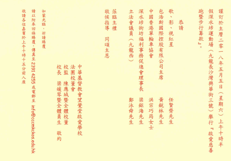 主禮團: 任賢齊先生 (歌、影、視紅星) 黃銳林先生 (包浩斯國際控股有限公司主席) 洪宗巧筠女士 (中國香港單輪車協會) 梁鉅海先生 (深水埔街坊福利事務促進會理事長) 鄭泳舜先生 (立法會議員)